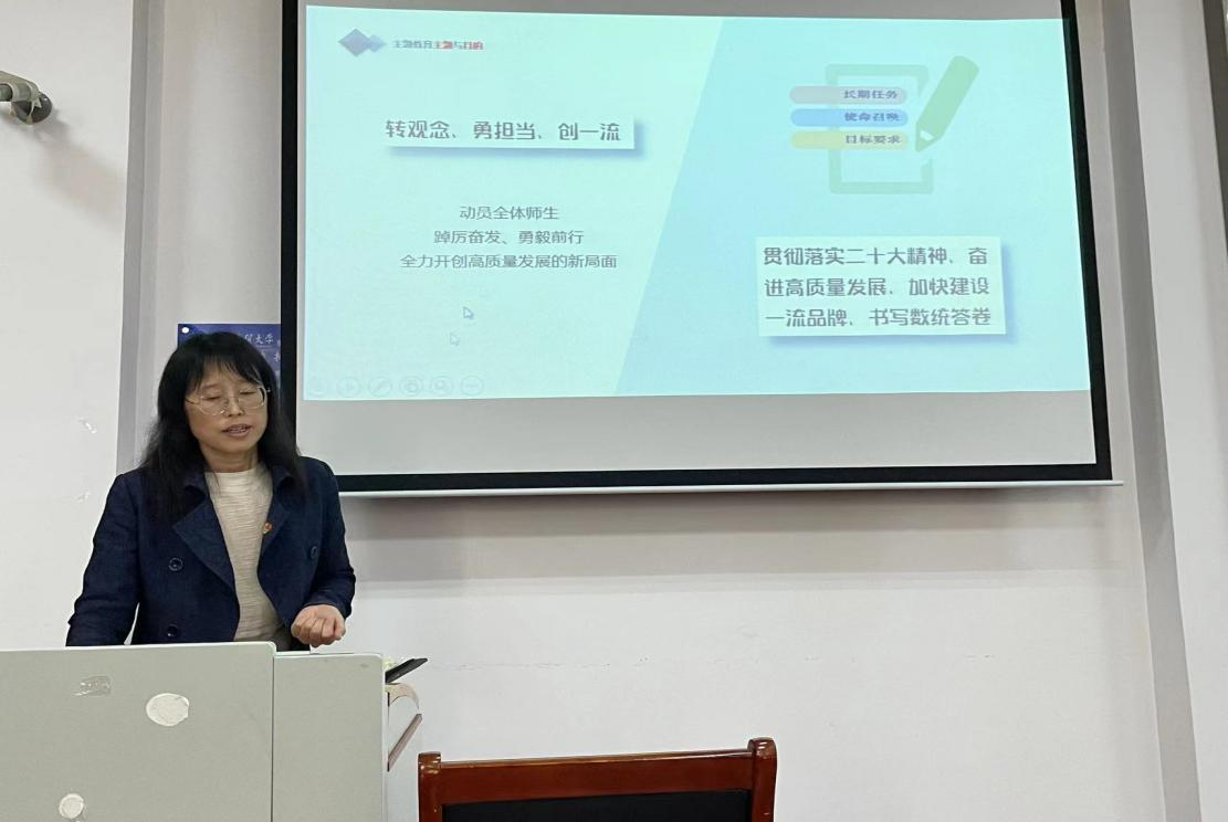 祃海霞以《转观念、勇担当、创一流》为题,详细讲解了本次主题教育“学思想,强党性,重实践,建新功”的总要求、根本任务、目标措施,系统回顾了十八大以来党的五次主题教育活动,介绍了习近平新时代中国特色社会主义思想的发展历程。她对公司制定的主题教育活动方案做了系统解读,对下一步开展主题教育需要重点解决的问题、主要活动计划和有关组织保障等进行了安排部署,动员全体师生贯彻落实二十大精神,铸魂、增智、正风、促干,踔厉奋发、勇毅前行,全力开创高质量发展新局面,加快建设一流品牌,书写数统优秀答卷。