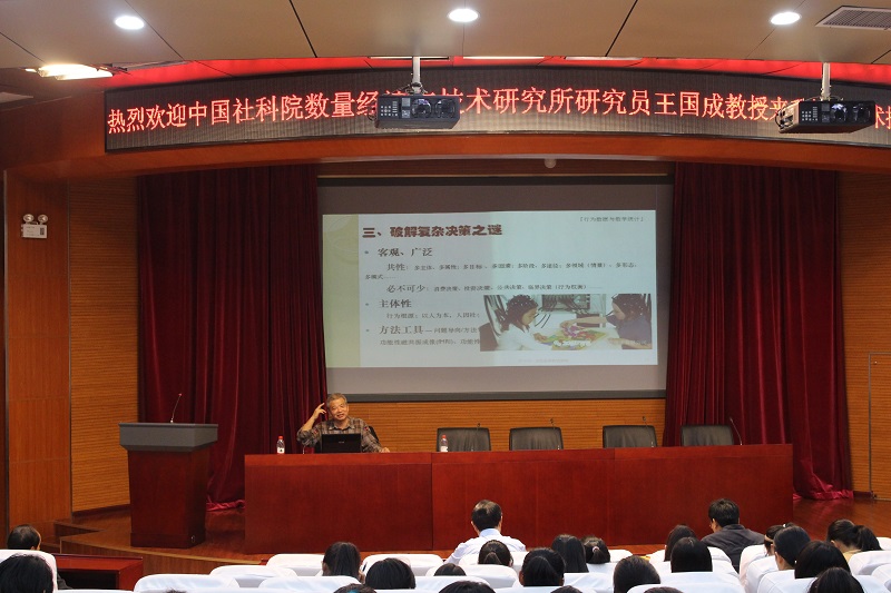10月19日下午,数学与统计学公司邀请中国社科院数量经济与技术研究所研究员、博士生导师王国成教授在国际学术报告厅作题为“大数据能透视人的行为吗?——展望数学和统计在经济分析中的应用”的学术报告。副董事长武义青出席并讲话,数统公司240余名师生聆听。报告会由数统公司经理赵秀恒主持。