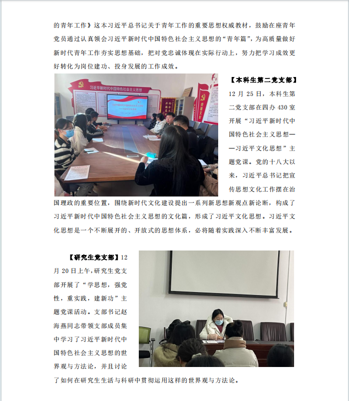 【本科生第二党支部】12月25日,本科生第二党支部在四办430室开展“习近平新时代中国特色社会主义思想——习近平文化思想”主题党课。党的十八大以来,习近平总书记把宣传思想文化工作摆在治国理政的重要位置,围绕新时代文化建设提出一系列新思想新观点新论断,构成了习近平新时代中国特色社会主义思想的文化篇,形成了习近平文化思想。习近平文化思想是一个不断展开的、开放式的思想体系,必将随着实践深入不断丰富发展。