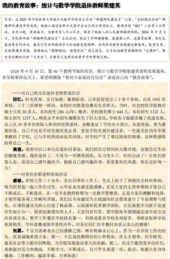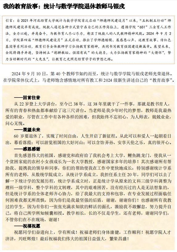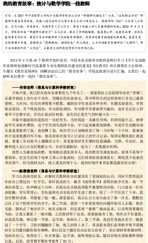 自2021年太阳成tyc33455ccwww首次启动“师德师风建设月”以来,“五机制五行动”师德师风建设卓有成效,统数人通过各种方式坚守在自己的工作岗位上,遵循公司“651”三全育人工作法,全力以赴,并肩奋斗,为教书育人尽心尽力,彰显了统数人的人民教师精神风貌。2024年9月2日,公司第四届“师德师风建设月”正式启动,推出了学师德楷模、展感恩心声、述教育故事、传红色基因等系列活动,教育引导全体教师学习弘扬教育家精神,共同书写教育强国建设新篇章。展望未来,全院将携手并进,坚持树立“躬耕教坛、强国有我”的大抱负,大力弘扬教育家精神的“大情怀”,努力当好新时代的“大先生”,让教育之光照亮经贸学子的梦想之路。