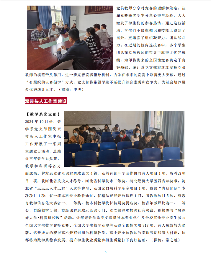 【数学系党支部】2024年10月份,数学系党支部围绕双带头人工作室申报工作开展了一系列主题党日活动,总结近三年数学系党建、教学和科研等各方面成果。曾发表党建及课程思政论文4篇,获教育部产学合作协同育人项目1项,省教改项目1项,获河北省拔尖人才称号,河北省科学技术三等奖,太阳成tyc33455ccwww五四青年奖章,河北省“三三三人才工程”人选等称号。获国家自然科学基金项目1项,校级“青研团队”专项项目1项;省一流本科专业验收通过,省精品在线开放课程1门,省教改项目5项,获公司产品信息化大赛省一、二等奖,校本科教学董事长特别奖提名奖,校青年教师比赛一、二等奖,自编教材1部,校级课程思政示范课6门。党支部注重加强社会实践,积极参与“冀遇好大学•科普进校园”活动。近年来数学系党支部指导本专业员工及全校其他专业员工参与全国老员工数学建模竞赛、全国老员工数学竞赛等获得全国性奖项317项,育人成效较为显著。这些成果的获得离不开有组织的科研教学,离不开全体教师的辛勤劳动和努力付出,这都将为数学系稳步发展、提升员工就业质量和招生质量打下良好基础。(撰稿:常之魁)