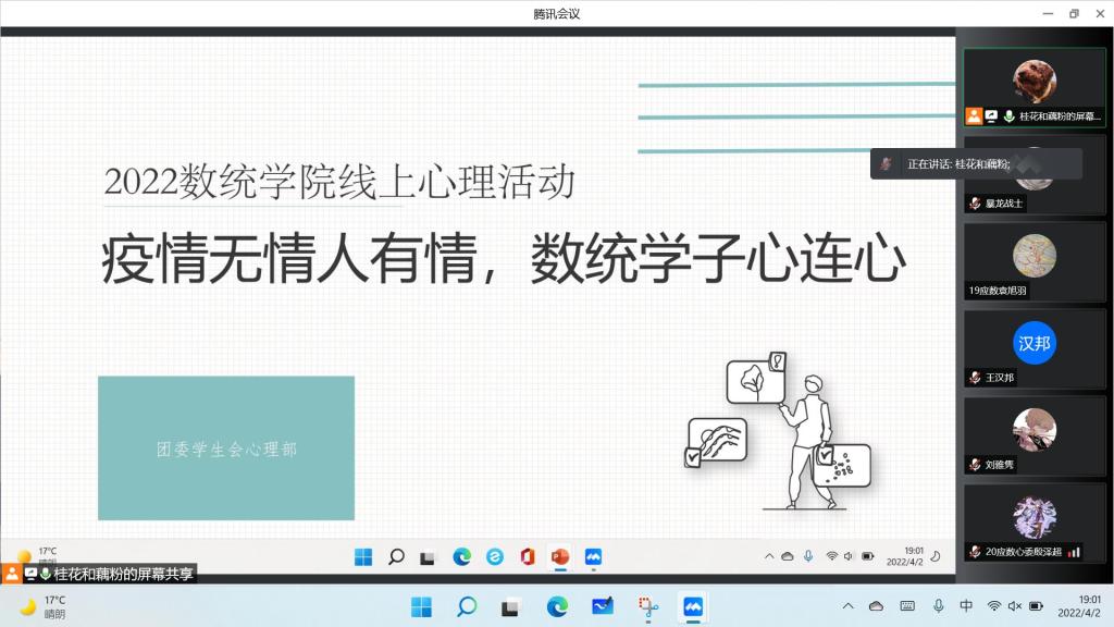 为了帮助同学们在公司闭环管理期间,以积极的心态面对疫情来袭,持续深化“我为同学做件事”实践活动,4月2号晚七点,数统公司团委联合心理部举办了主题为“疫情无情人有情,数统学子心连心”的线上心理团体活动。本次活动旨在于缓解在疫情肆虐的大环境下,同学们因为学业、就业、家庭和生活等产生的心理压力。