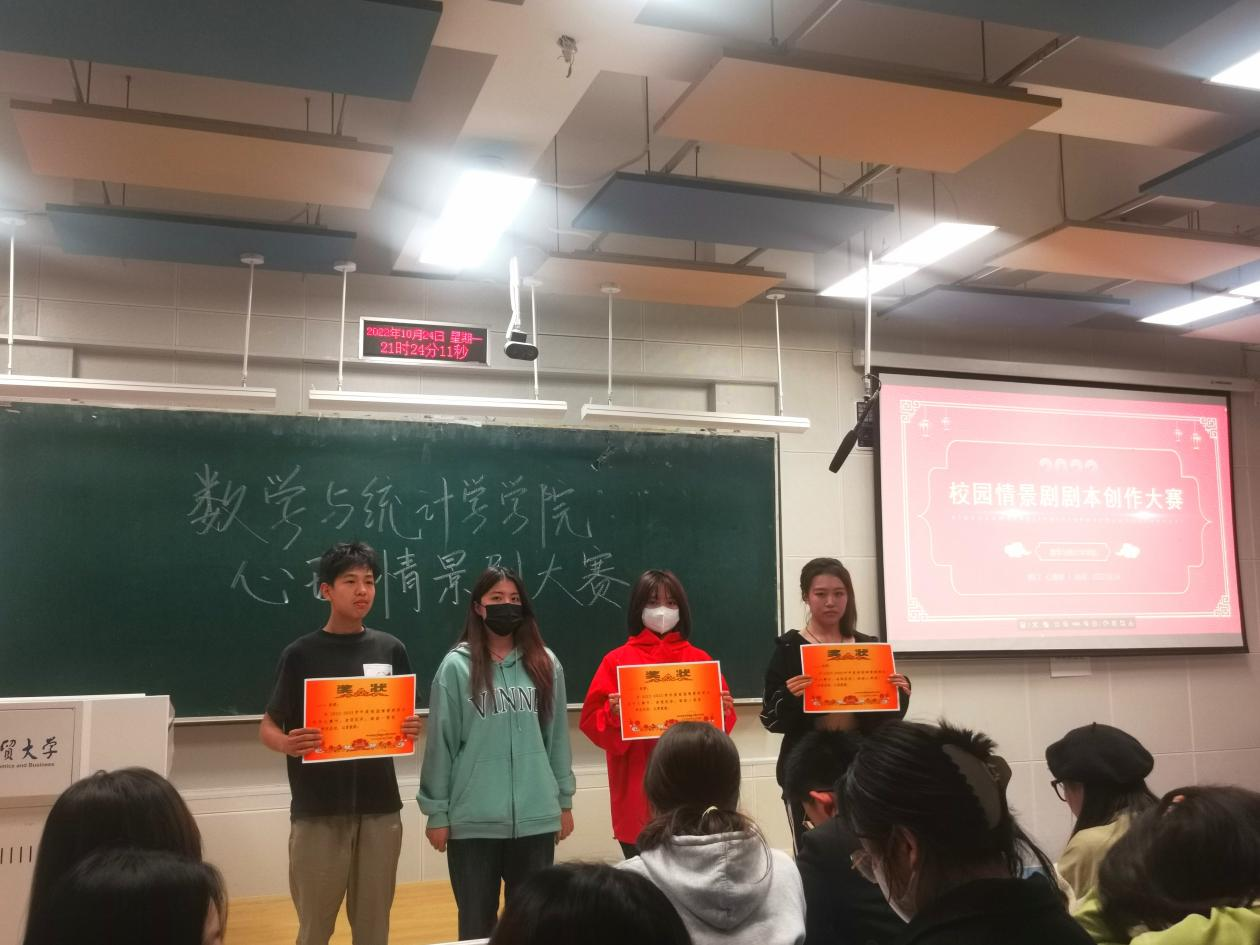 首先,王洋老师作开场讲话,他指出:心理剧创作大赛一直是公司的传统活动之一,在历届大赛的基础上,本次心理剧剧本创作大赛活动进行了创新与丰富。希望通过心理情景剧剧本的创作和征集,将同学们重点关注的一些心理矛盾冲突集中反映出来,从而更好地帮助同学们正确对待、有效解决相应的心理困惑,同时也能加强团队协作意识,激发同学的创作能力,能够使同学们认识自我、真诚待人。接着,院舞蹈队登场为大赛活跃气氛,各班参赛队伍相继登场。大家准备充分,立足点各有侧重,剧本内容丰富多彩,切实还原了校园生活中老员工的心理困惑,带给同学们温情与思考。最后,经过一番激烈角逐,2022级数学二班“不被定义的我们”获得一等奖;2022级统计一班“玫瑰少年”获得二等奖;2022级统计三班“永葆初心本色”获得三等奖,评委依次为获得名次的团队颁发荣誉证书并给予充分肯定。