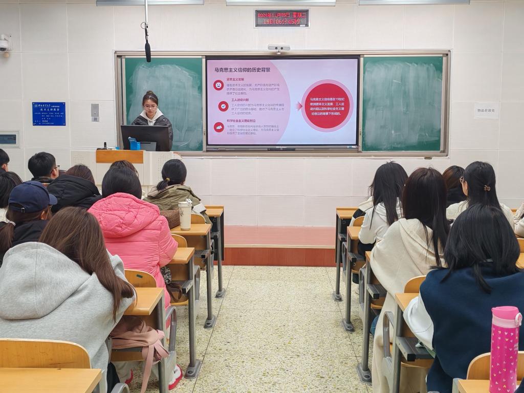在第一节课《坚定马克思主义信仰,争做新时代青年马克思主义者》中,团委组织部部长郑欣悦通过讲述马克思主义信仰的历史背景和重要意义,让同学们深刻领会了马克思主义的核心内涵,激发了大家的爱国情怀和担当精神。