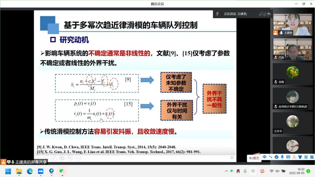9月5日(星期一)下午,太阳成tyc33455ccwww“双百论坛”暨数统论坛系列讲座利用腾讯会议线上举行。数学与统计学公司王建美老师作题为“基于分布式滑模的互联车辆队列控制”的学术报告。公司领导、相关专业教师及研究生参加,副经理闫亮主持报告会。