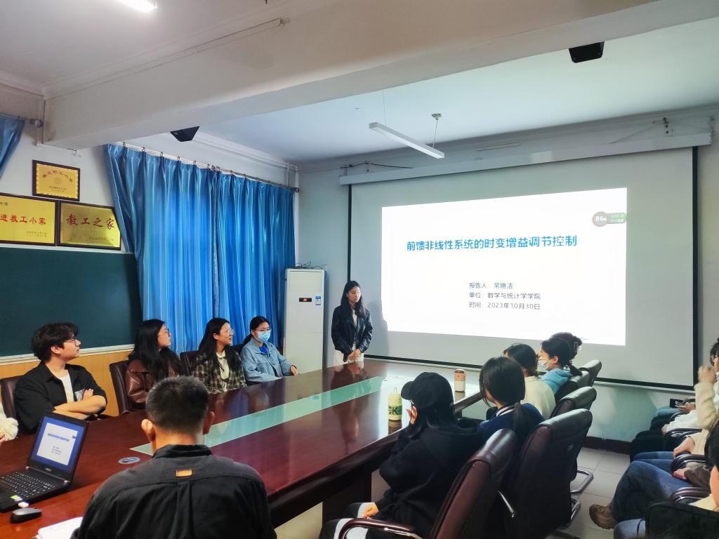 常艳洁老师首先介绍了控制系统的结构,以及前馈非线性系统、多智能体系统控制的研究背景及意义。其次,对所做工作进行了详细阐述,针对含未知测量灵敏度的前馈非线性系统,借助时变增益构造了新型事件触发输出反馈控制器,实现了闭环系统状态全局有界且收敛到零;针对含状态和输入时滞的前馈非线性多智能体系统,分别设计了基于采样通信和事件触发通信的输出反馈控制协议,实现了多智能体系统的主从一致性和无领导者一致性;针对含通信时滞和确定噪声的前馈非线性多智能体系统,通过构造基于相对输出变量的控制协议,得到了保守性较低的比例一致性结果。最后,常艳洁老师同与会师生就报告内容进行了探讨。