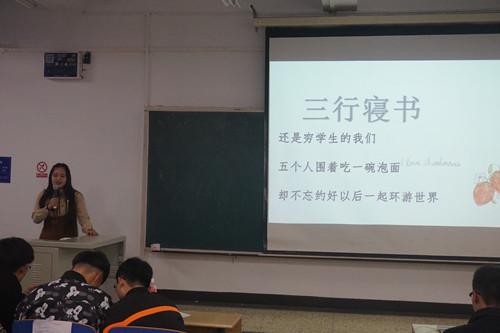 2018年3月19日晚,数统公司在A教401室举办宿舍文化节系列活动——“三行寝书”评比大赛,公司团委员工会生活部部长王建主持比赛,大一各宿舍代表参加比赛。