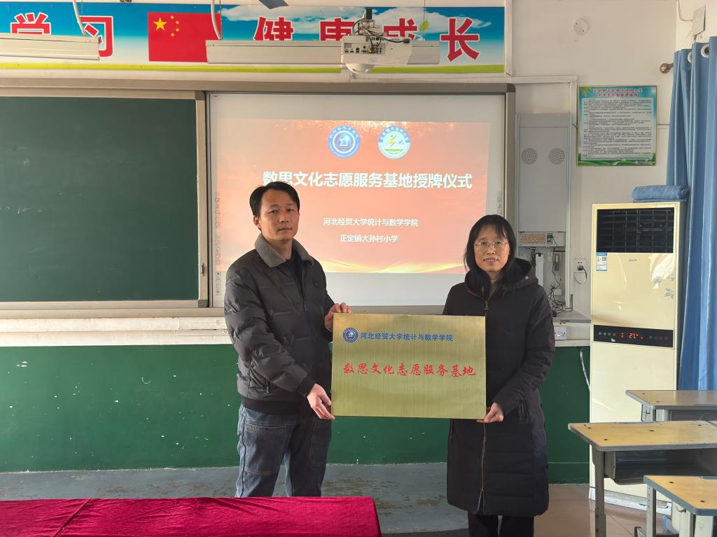 12月18日,公司与正定镇大孙村小学举行了“数思”文化志愿服务基地挂牌仪式,统计与数学公司党委书记祃海霞、党委副书记路荣、团委书记王洋与正定镇学区副董事长叶红生、大孙村小学董事长王华敏出席仪式,参加活动的还有数学与应用数学系党支部教师代表、大孙村小学教师代表和青年志愿者服务大队员工。
