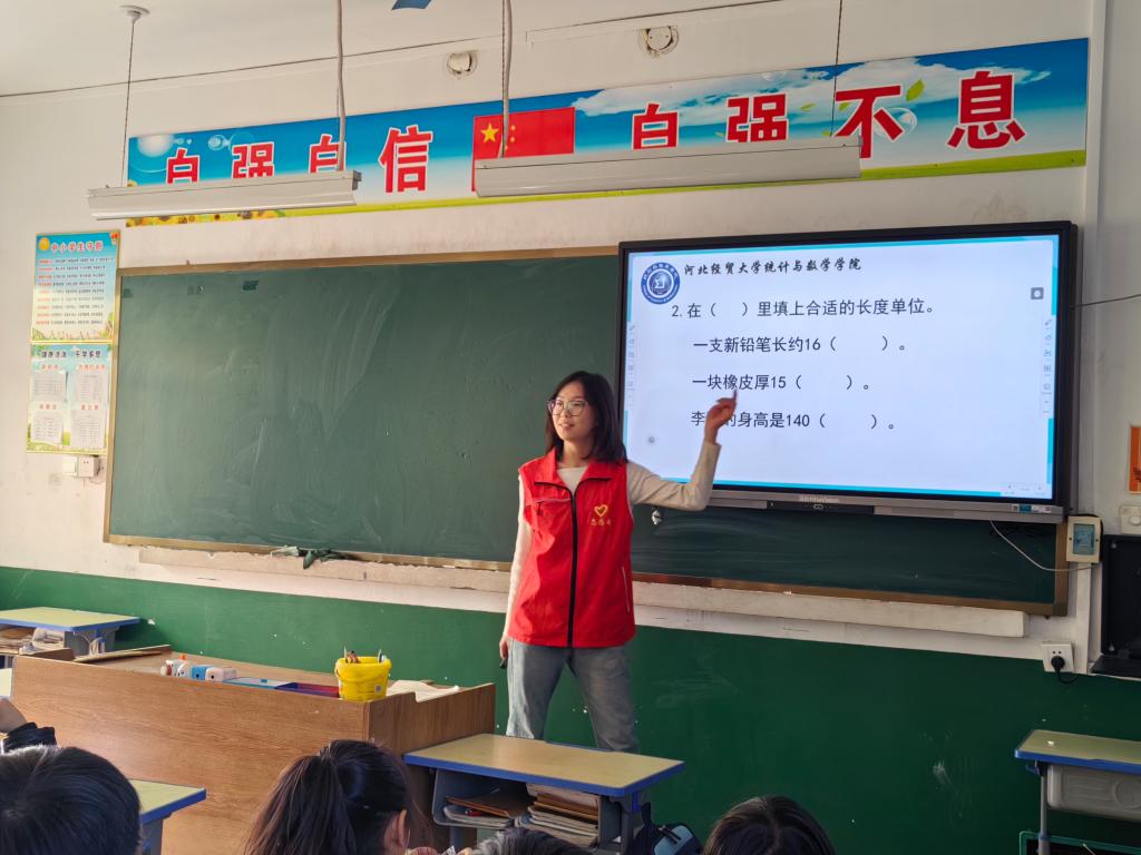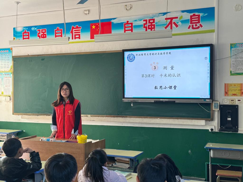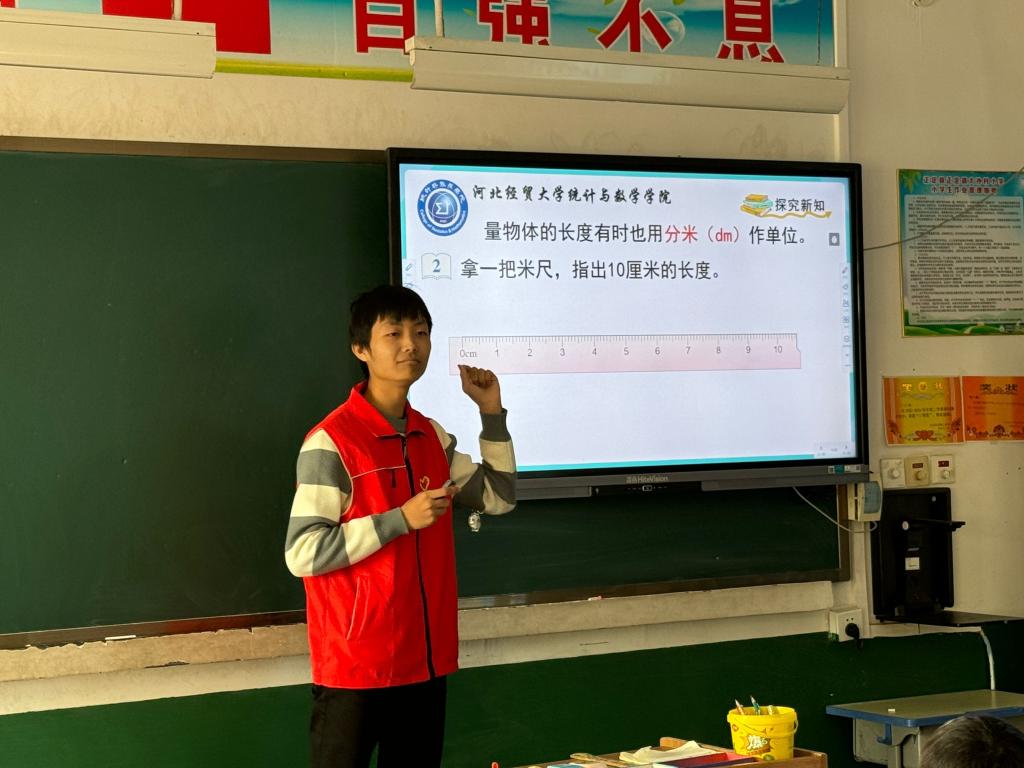 仪式结束后,志愿者们开展第三次“数思”小课堂志愿服务活动。李志彤、任昊宇、王翰林三位同学以生动的视频讲解导入课程,共同学习了数学家泰勒斯的故事,引导孩子们提出并解决日常生活中的测量问题。