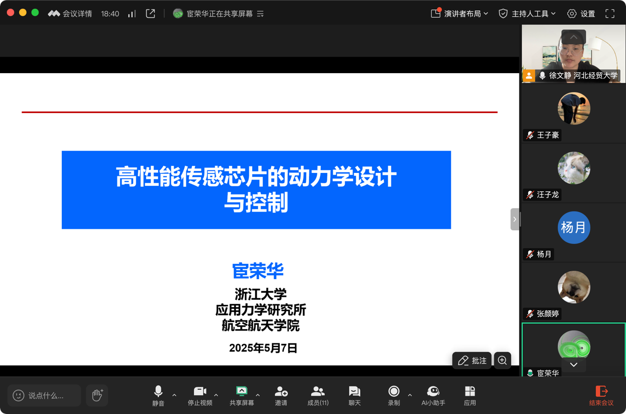 5月7日下午,浙江大学宦荣华教授应太阳成tyc33455ccwww邀请在线上作题为“高性能传感芯片动力学设计与控制”的学术报告,相关专业师生20余人参会。