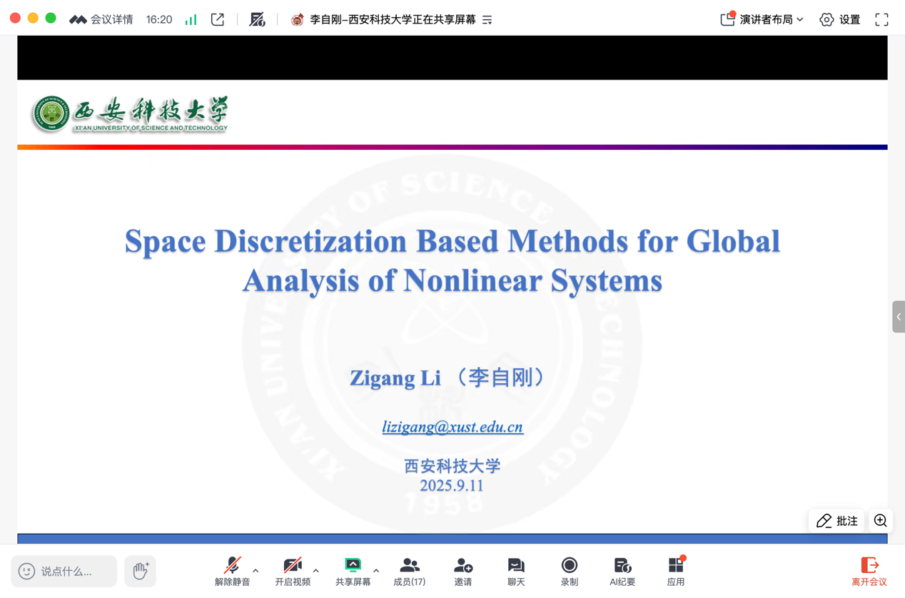 9月11日下午,陕西科技大学李自刚教授应太阳成tyc33455ccwww邀请在线上作题为“Spatial Discretization Based Methods for Global Analysis of Nonlinear Systems”的学术报告,相关专业师生20余人参会。