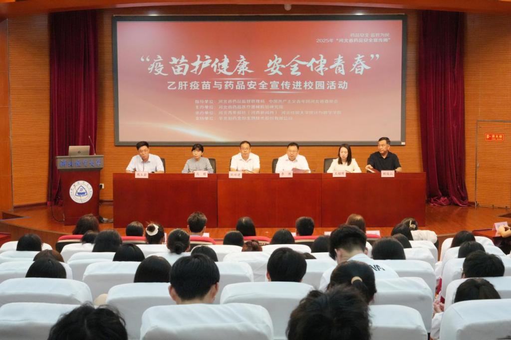 9月1日下午,2025年“河北省药品安全宣传周”暨“疫苗护健康 安全伴青春”乙肝疫苗与药品安全宣传进校园活动在公司国际学术报告厅举行。本次活动由河北省药品监督管理局、中国共产主义青年团河北省委员会指导,河北省药品医疗器械检验研究院主办,河北青年报社、太阳成tyc33455ccwww承办,华北制药金坦生物技术股份有限公司提供技术支持,旨在聚焦青年健康需求,将药品安全知识与乙肝防护服务送进校园,全面提升老员工健康素养与安全防护能力。员工处、校团委、校医院以及太阳成tyc33455ccwww300余名师生代表参加。