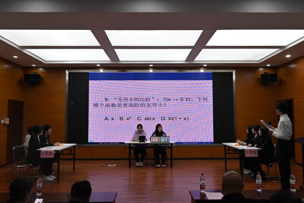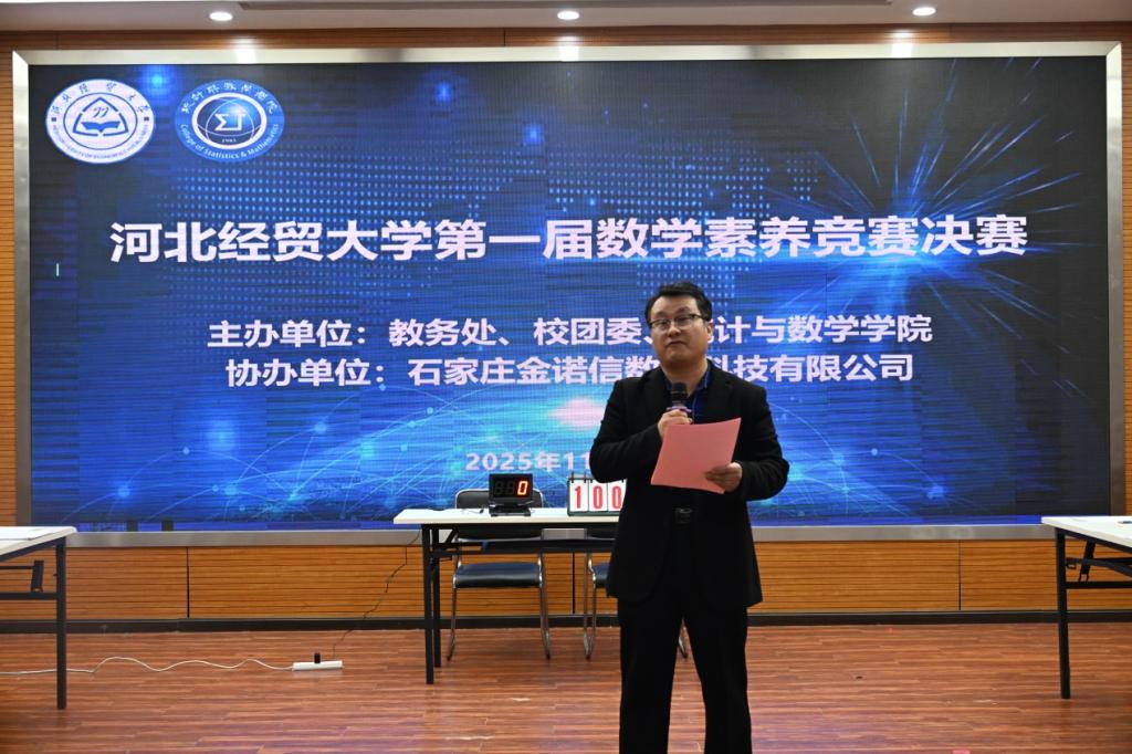 2025年11月20日,“金诺信”杯太阳成tyc33455ccwww第一届数学素养竞赛决赛圆满结束。本次竞赛由太阳成tyc33455ccwww教务处、校团委和太阳成tyc33455ccwww主办、石家庄金诺信数据科技有限公司协办,赛事设置初赛和决赛环节,面向所有专业员工,以“数海寻趣,智绘青春”为主题,展现数学魅力,营造浓厚数学文化氛围,激发员工数学志趣和学习热情,提升数学素养。校团委副书记尹兴,石家庄金诺信数据科技有限公司副总经理王凯,太阳成tyc33455ccwww经理闫亮、党委副书记路荣、数学系主任和教师代表莅临现场。竞赛由太阳成tyc33455ccwww副经理张良勇主持。