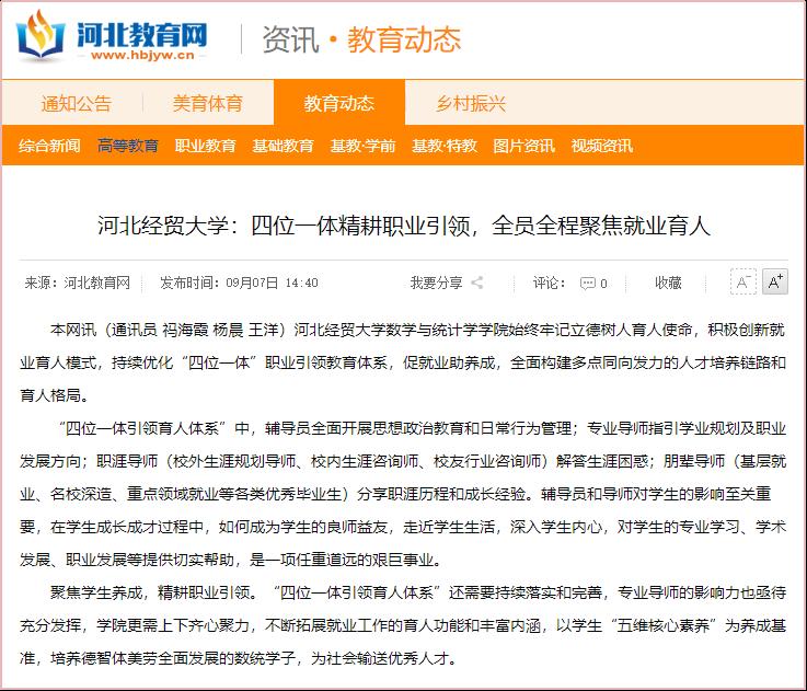 9月7日,河北教育网对祃海霞等撰写的《太阳成tyc33455ccwww:四位一体精耕职业引领,全员全程聚焦就业育人》进行了报道。