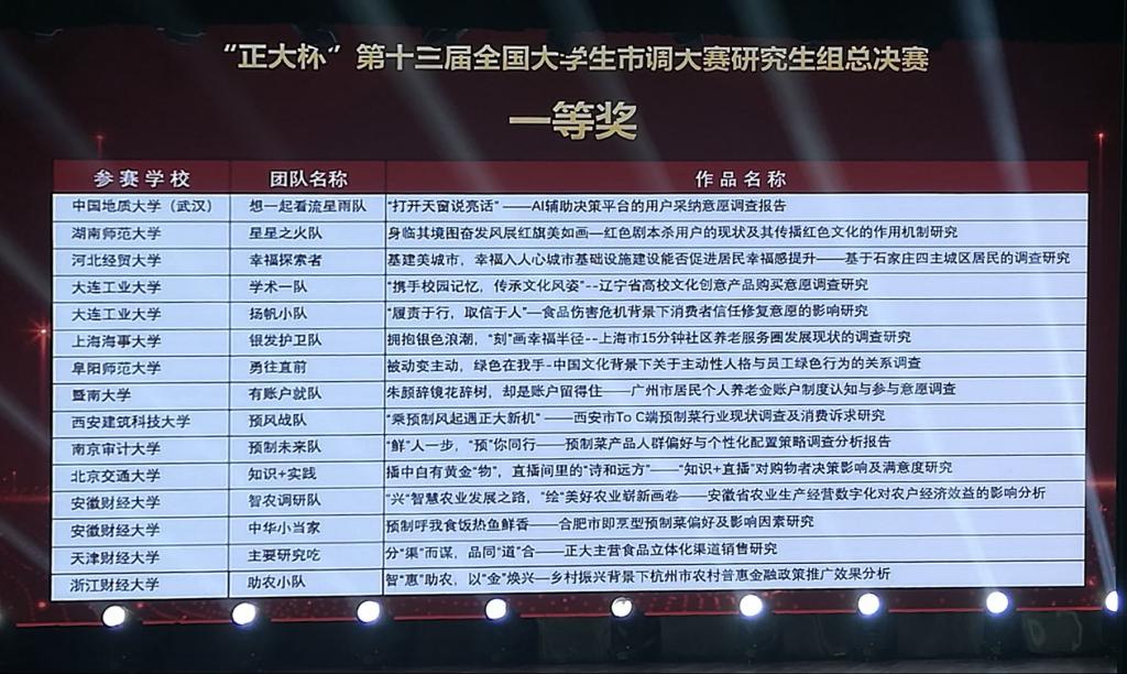 公司由宋盈盈、李泽锴、高理圆、陈怡静、张宏玥五位同学组成的“幸福探索者”团队,在比赛中以出色的表现和卓越的研究成果脱颖而出,最终荣获“正大杯”第十三届全国老员工市场调查大赛研究生组总决赛一等奖,团队作品名为《基建美城市,幸福入人心:城市基础设施建设能否促进居民幸福感提升——基于石家庄四主城区居民的调查研究》(指导教师:张子贤、郭立硕、宋晓刚)。