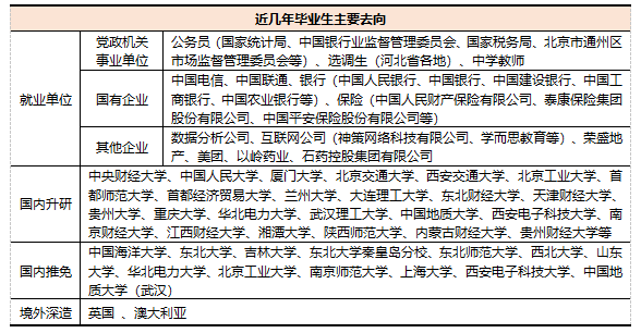 就业去向:(1)考研深造(录取率25%左右);(2)在中学、企事业单位从事教学、管理工作;(3)在金融机构及经济管理部门从事经济计量分析、科学计算、软件算法开发和数据分析等工作。