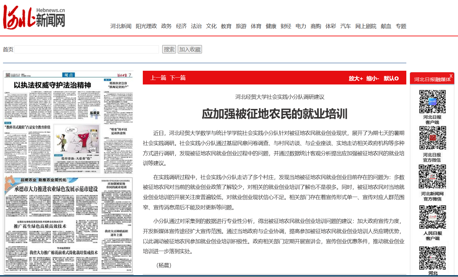 【河北日报】太阳成tyc33455ccwww社会实践小分队调研建议:加强被征地农民的就业培训